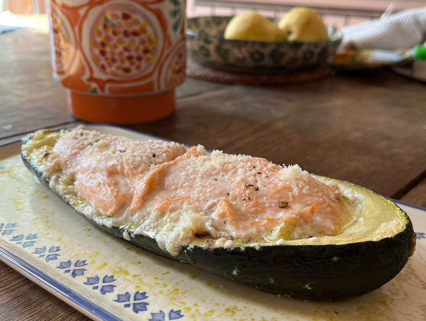 Par dessus, ajouter un pavé de saumon sur chacune des courgettes.